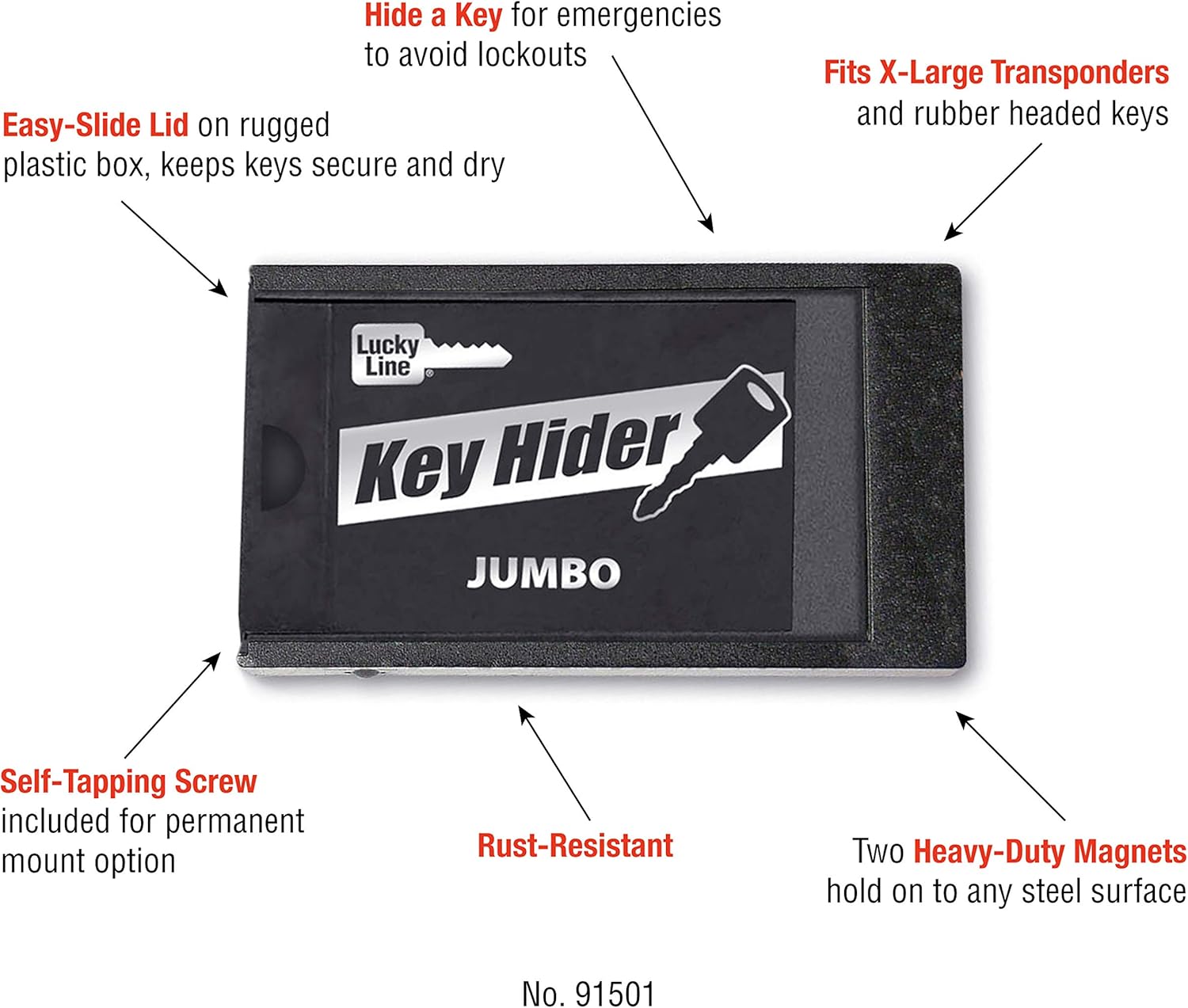 Introducing the Lucky Line Jumbo Magnetic Key Hider (91501) – designed to securely hold larger keys and transponders. Say goodbye to the hassle of misplaced keys with this convenient case holder. Get peace of mind knowing your keys are safe and easily accessible with this reliable product from Lucky Line.